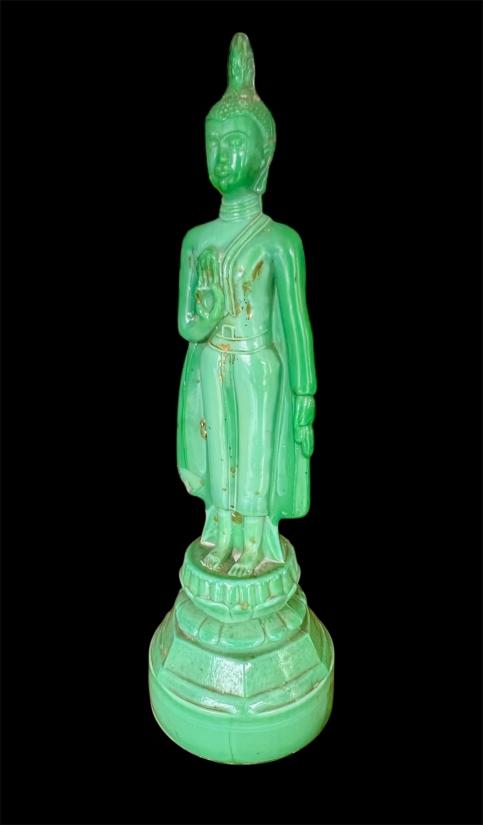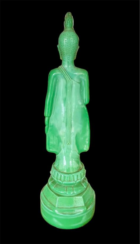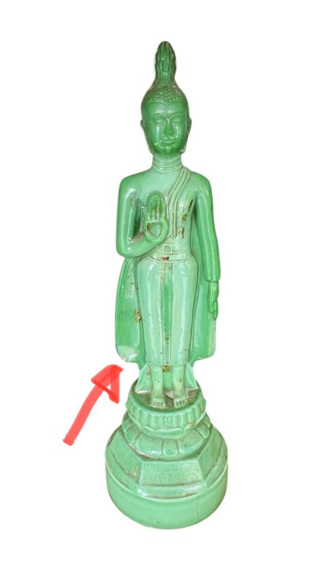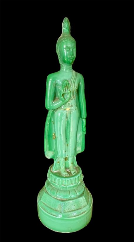 พระแก้ว 25 ศตวรรษ ปางห้ามญาติ ประจำวันจันทน์ ฐานเพชร เนื้อแก้วสีหยก ผิวหิ้ง หายากครับ สูง 13 นิ้ว สภาพสวยตามรูปครับ(มีบิ่นนิดหน่อยที่ชายสบงด้านล่างตามภาพศรชี้ครับ ) ราคาเบาๆเคาะเดียวครับ