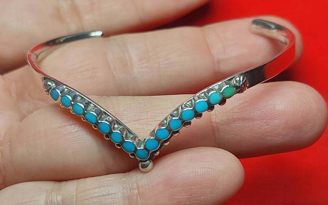 กำไลข้อมือเงินฝังเทอร์ควอยซ์รูปตัววี สไตล์ชนพื้นเมืองอเมริกันเผ่าซูนิ (Zuni Native American) งานนอก มือ2
