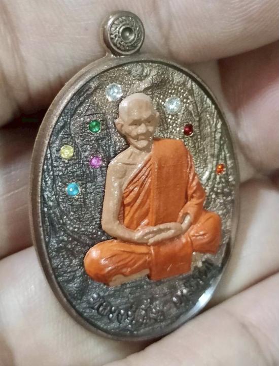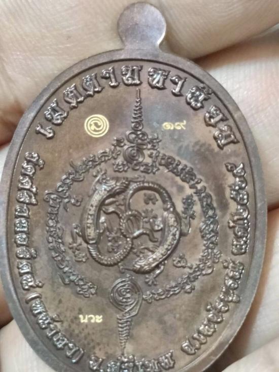 เหรียญหลวงปู่ฝั้น วัดศรีถมอรัตน์ จ.เพชรบูรณ์ รุ่นเมตตามหานิยม เนื้อนวะหน้ากากเพ้นท์ ฝังพลอย มีโค๊ตยันต์ ตัวนะ โค๊ต นวะ โค๊ตหมายเลข 19