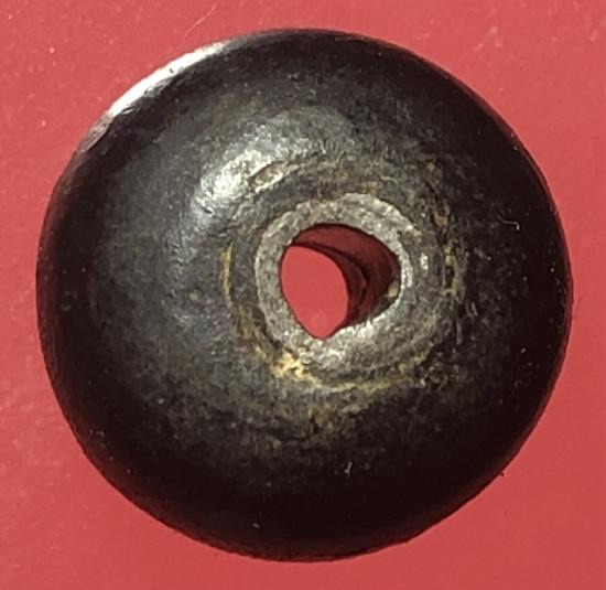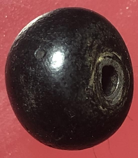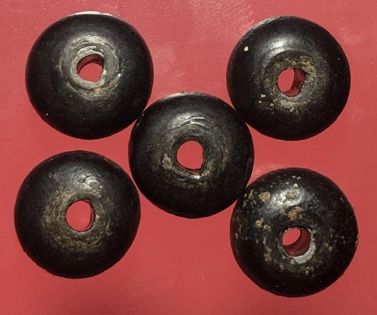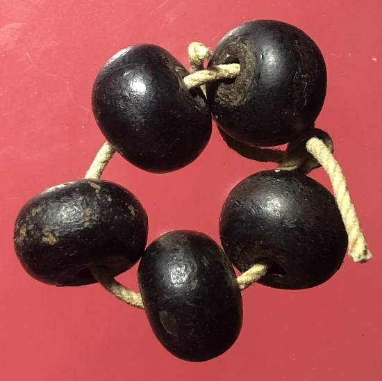 เม็ดประคำเนื้อผงคลุกรักจุ่มรักแกนตะกั่วเก่ามีอายุร้อยกว่าปี ขนาดเม็ดใหญ่ 1.4 ซม.จำนวน5เม็ด ไม่ยัดวัดไม่ทราบที่