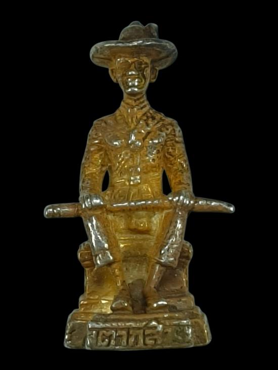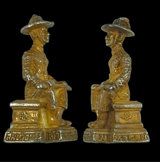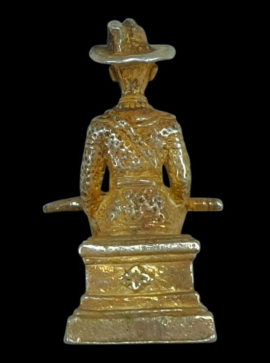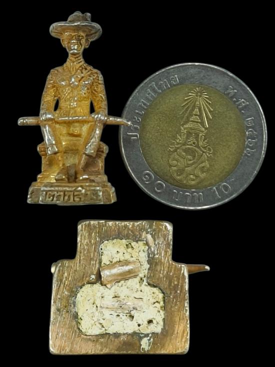 รูปหล่อสมเด็จพระเจ้าตากสินมหาราช เนื้อเงินชุบทอง ก้อนอุดมวลสารฝังตะกรุดสีเงิน 2 ดอก ไม่ทราบที่ไม่แพงครับ
