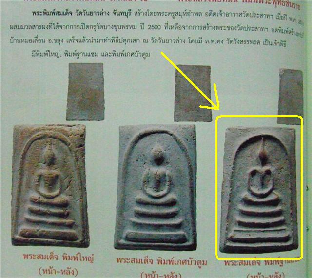 พระสมเด็จวัดวันยาวล่าง จันทบุรี (ปลุกเสกพิธีใหญ่) เนื้อหามวลสารดีมากเพราะมีส่วนผสม ของผงพุทธคุณต่าง ๆ รวมทั้งผงพระที่แตกหักจากพระสมเด็จวัดบางขุนพรหม พระที่เหลือจากที่สร้างพระพิมพ์หลวงปู่ทวด วัดประสาทฯ ที่โด่งดัง สร้างปี 2516 หลวงพ่อคง เทพเจ้าแห่งวัดวังสรรพรสร่วมปลุกเสก เมตตาดีมาก ปัจจุบันเริ่มหายากแล้วครับ เคาะเดียว