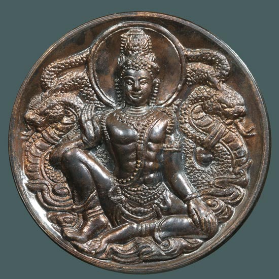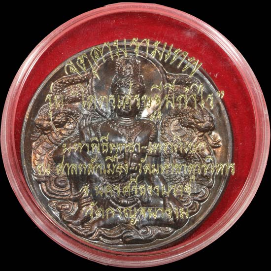 จตุคามรามเทพ "รุ่น โคตรเศรษฐีมีกำไร" สมทบทุนสร้างอุโบสถ วัดกาญจนาราม มหาพิธีพุทธา-เทวาภิเษก ณ ศาลหลักเมืองนครศรีธรรมราช พ.ศ. 2550 เหรียญบาตรน้ำมนต์ "เนื้อนวะโลหะ" ขนาดเส้นผ่าศูนย์กลาง 5.5 ซ.ม. สวย