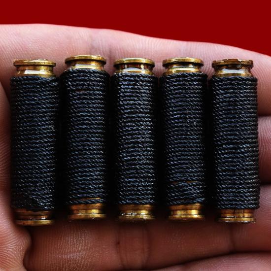 ชุด 5 ดอก...ตะกรุดปลอกลูกปืน (แคล้วคลาด ป้องกันอันตราย) ปี 2555 หลวงปู่เฉลิม วัดบุญนาคประชาสรรค์ จ.สมุทรสงคราม พร้อมซองรูปเดิมจากวัด สภาพพระตามรูปที่ลงทุกประการ (ขนาดยาวประมาณ 3.8 ซม.)