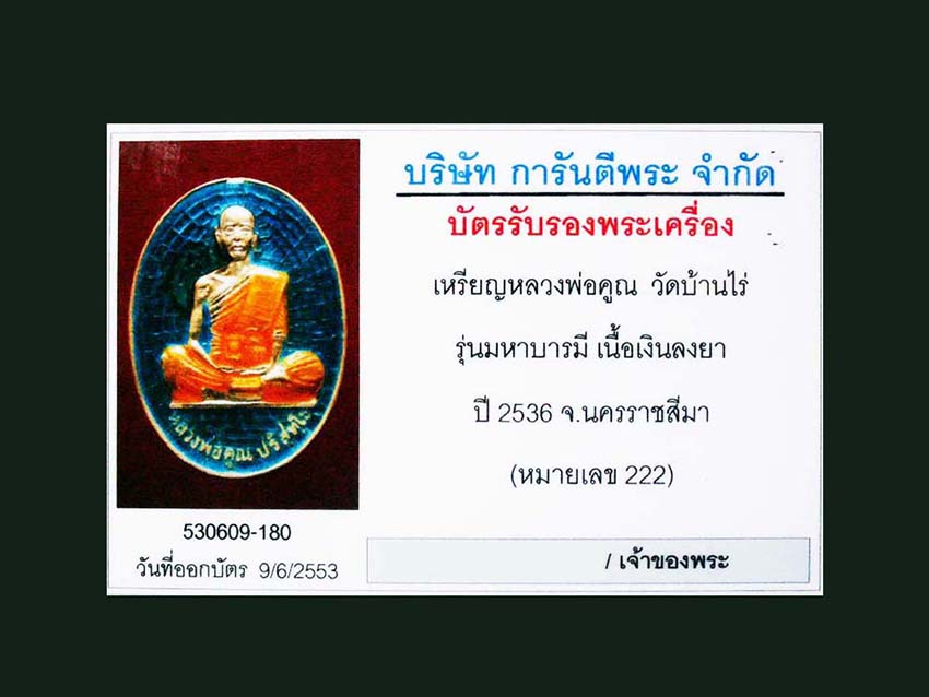เลขตอง 222......เหรียญหลวงพ่อคูณ วัดบ้านไร่ รุ่นมหาบารมี เนื้อเงินลงยาสีฟ้า หมายเลข 222 ปี 2536 จ.นครราชสีมา พร้อมบัตรการันตีพระ