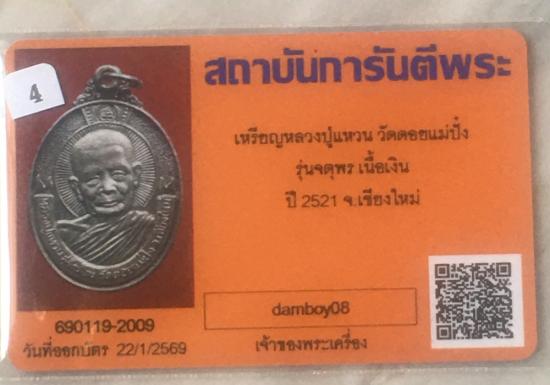 เหรียญหลวงปู่แหวน รุ่นจตุพร เนื้อเงิน ปี 2521