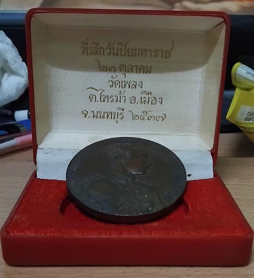 เหรียญบาตรน้ำมนต์ พระบาทสมเด็จพระจุลจอมเกล้าเจ้าอยู่หัว รัชกาลที่ ๕ ออกวัดเพลง จ.นนทบุรี ปี 37 กล่องเดิม