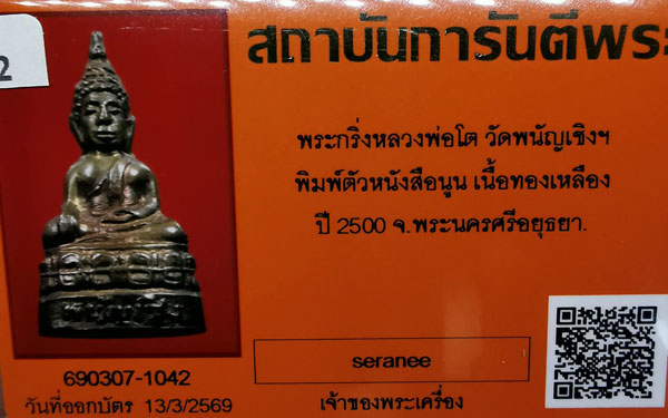พระกริ่งหลวงพ่อโต วัดพนัญเชิง หนังสือนูน เนื้อทองเหลือง กริ่งดัง ปี2500 จ.พระนครศรีอยุธยา + บัตรG-pra สภาพเดิมค่ะ สภาพตามรูปทุกประการค่ะ