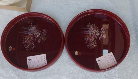 ***วัดใจ***ถาดไม้เคลือบเงา (Wajima-nuri lacquerware) งานศิลปะโรยผงทอง ถาดเคลือบแล็กเกอร์รุ่นพิเศษ 2ใบ 2ขนาด สภาพใหม่เก่าเก็บ เป้นถาดบุชา