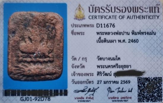 พระหลวงพ่อปาน พิมพ์ทรงเม่น เนื้อดินเผา พ.ศ.2460 รุ่นแรกเก่าแท้ๆ บัตร 2ใบ บัตรรับรองพระแท้สมาคมพระเครื่องพระบูชาไทย และ สยามวัตถุมงคล หายากควรค่าแก่สะสม