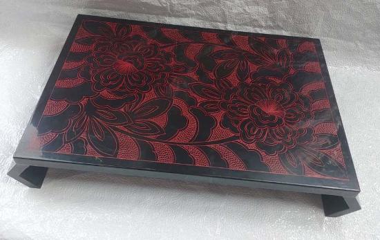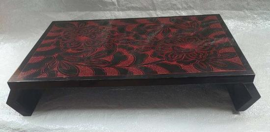 แท่นวางพระ โต๊ะญี่ปุ่นโบราณหรือ "ซาทาคุ" (Zataku) ที่ทำจากไม้และตกแต่งด้วยเทคนิคการลงรักปิดทอง (Makie) ที่มีลวดลายดอกไม้สีแดงบนพื้นสีดำ สินค้ามือสองมีรอยตามการ