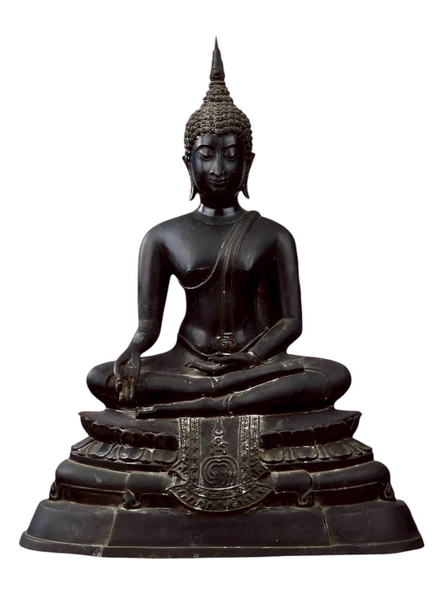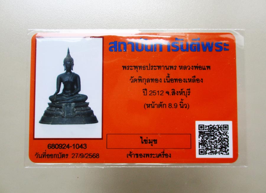 พระพุทธประทานพร หลวงพ่อแพ วัดพิกุลทอง จ.สิงห์บุรี พ.ศ.2512 หน้าตัก 9 นิ้ว เนื้อโลหะรมดำมันปูผิวหิ้ง หล่อดินไทยสีดำ พร้อมบัตรพระแท้การันตีพระ !!
