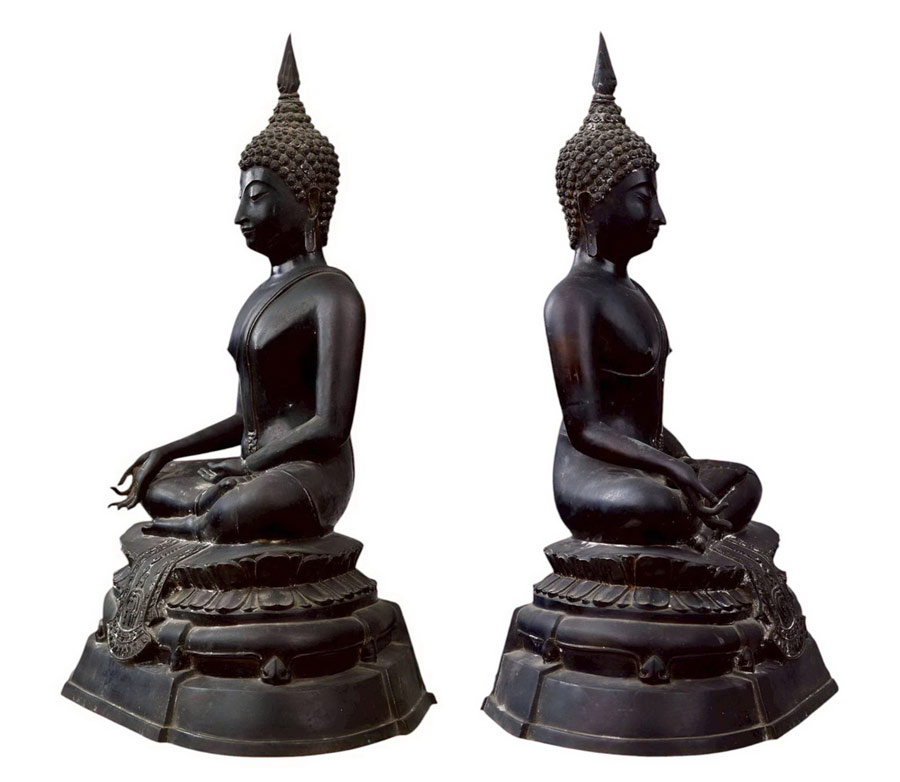 ฐานกว้าง 13.5 นิ้ว....ส่วนลึก 8 นิ้ว ขอบหนาๆงานเทหล่อดินไทยสีดำ มีตะปูยึดขึ้นหุ่นเทียนองค์พระ 5 ตัว !!