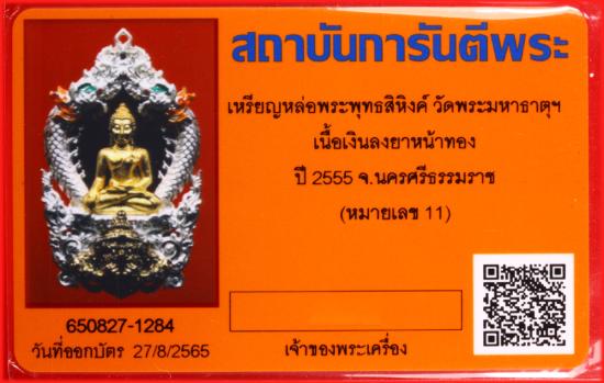 เหรียญหล่อพระพุทธสิหิงค์ วัดพระมหาธาตุฯ เนื้อเงินลงยาหน้าทอง ปี2555 จ.นครศรีธรรมราช (หมายเลข 11)