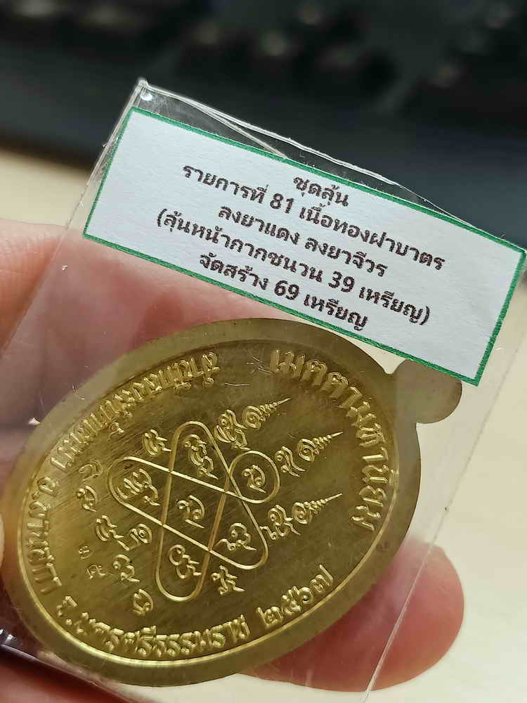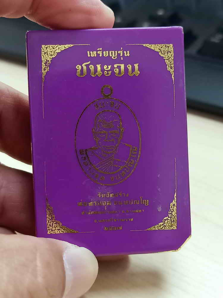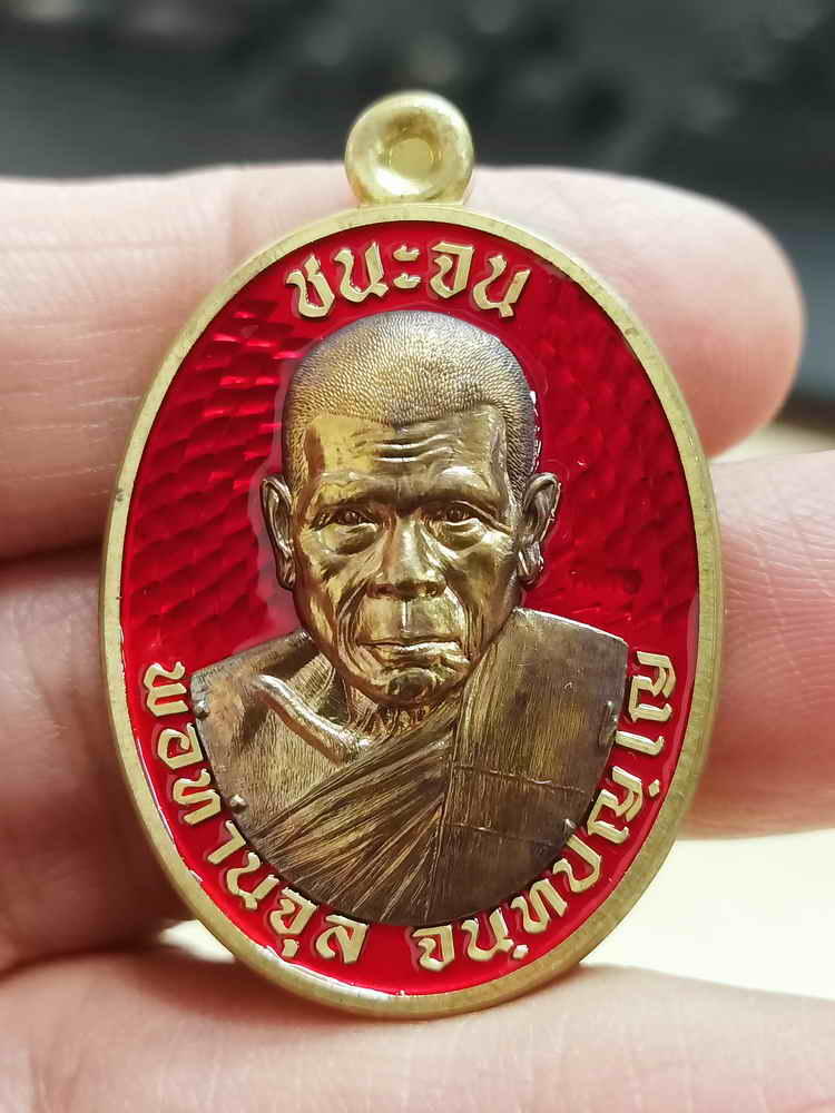 วัดใจ 100 เหรียญชนะจน พ่อท่านจุล สำนักสงฆ์ถ้ำเหมา นครศรีธรรมราช ปี 2567 ทองฝาบาตร ลงยาแดง หน้ากากชนวน หมายเลข 35 สร้าง 39 เหรียญ กล่องเดิม