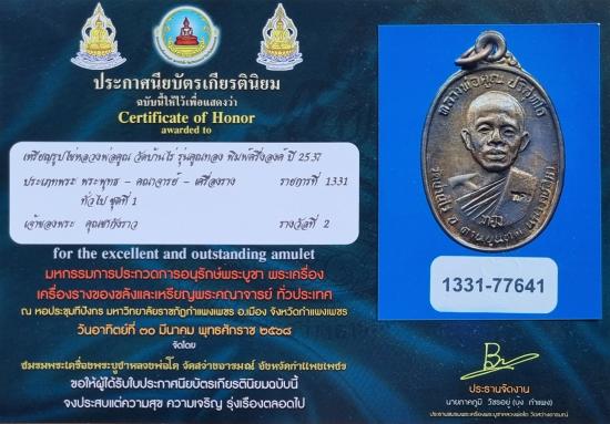เหรียญหลวงพ่อคูณ รุ่นคูณทอง เนื้อนวโลหะ ปี 2537 พร้อมใบประกาศ ติดรางวัลที่ 2 งานจังหวัดกำแพงเพชร (งานสมาคม)