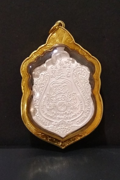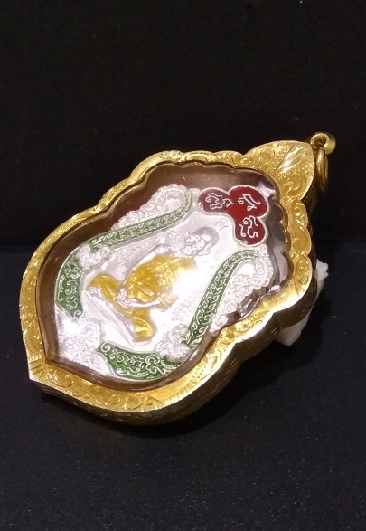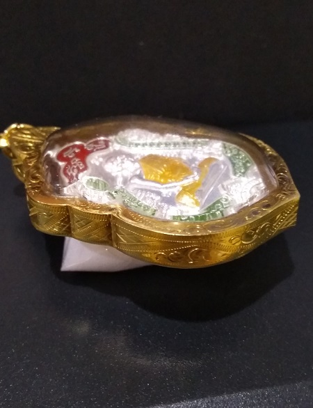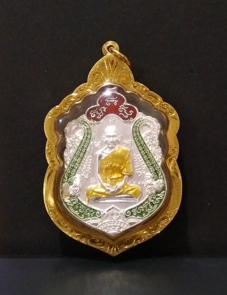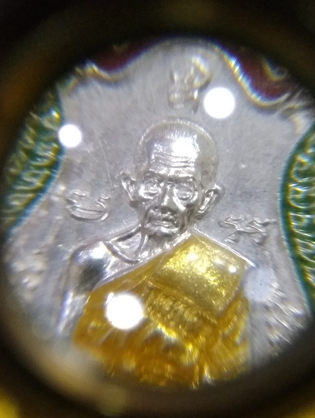 เหรียญเสมา หลวงพ่อรวย วัดตะโก อยุธยา รุ่นรวยทันใจ เลขโค๊ต 1055 ปี 2558 เนื้อเงินลงยาสีเขียว เลี่ยมทอง 80 % ตอกที่ห่วง กล่องครบ