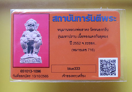 หนุมานรุ่นแรก หลวงพ่อสาคร วัดหนองกรับ เนื้อทองแดงเถื่อนก้นอุดผง หมายเลข 716(3หลัก) โค๊ดนะ สวยมาก กล่องเดิม