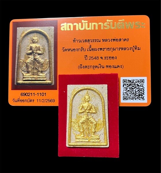 ท้าวเวสสุวรรณ หลวงพ่อสาครวัดหนองกรับ เนื้อผงพรายกุมารหลวงปู่ทิม ปี 2548 จ.ระยอง (ฝังตะกรุดเงิน-ทองแดง) สภาพสวยเดิม พร้อมบัตรรับรองจากสถาบันการันตีพระ และกล่องเดิม