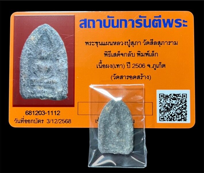 พระขุนแผนหลวงปู่สุภา วัดสีลสุภาราม พิธีเสด็จกลับ พิมพ์เล็ก เนื้อผง(เทา) ปี 2506 จ.ภูเก็ต (วัดสารอดสร้าง) พร้อมบัตรรับรองจากสถาบันการันตีพระ
