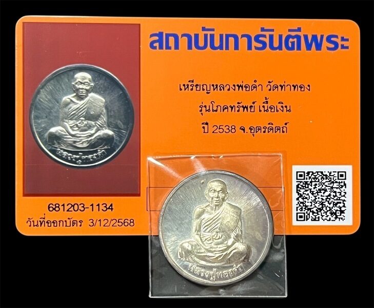 เหรียญหลวงพ่อทองดำ วัดท่าทอง รุ่นโภคทรัพย์ เนื้อเงิน ปี 2538 จ.อุตรดิตถ์ พร้อมบัตรรับรองจากสถาบันการันตีพระ