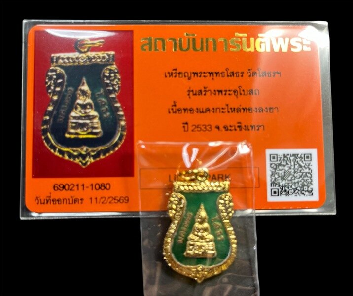 เหรียญพระพุทธโสธร วัดโสธรฯ รุ่นสร้างพระอุโบสถ เนื้อทองแดงกะไหล่ทองลงยา ปี 2533 จ.ฉะเชิงเทรา สภาพสวย พร้อมบัตรรับรองจากสถาบันการันตีพระ