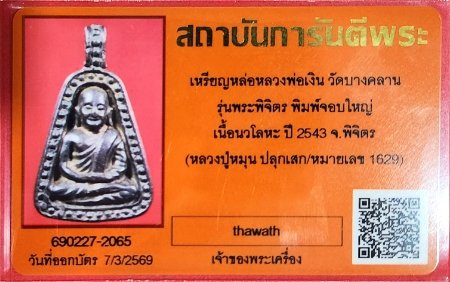 ชื่อพระเครื่อง เหรียญหล่อจอบใหญ่ หลวงพ่อเงิน รุ่นพระพิจิตร นวะโลหะ ปลุกพิธี ปี42-43 หลวงปู่หมุนร่วมปลุกเสก หมายเลข 1629