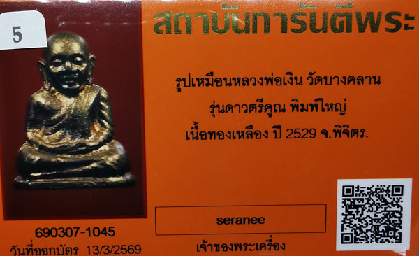 หลวงพ่อเงิน วัดบางคลาน รุ่นดาวตรีคูณ พิมพ์ใหญ่ เนื้อทองเหลือง กริ่งดัง ปี2529 จ.พิจิตร + บัตรG-pra สภาพสวยเดิมค่ะ