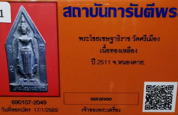 พระไชยเชษฐาธิราช วัดศรีเมือง เนื้อทองเหลือง(กริ่งดัง) ปี2511 จ.หนองคาย + บัตรG-pra สภาพเดิมค่ะ