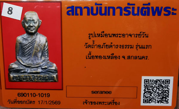 รูปเหมือนพระอาจารย์วัน วัดถ้ำอภัยดำรงธรรม รุ่นแรก เนื้อทองเหลือง จ.สกลนคร + บัตรG-pra สภาพเดิมค่ะ