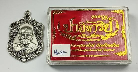 เหรียญ รุ่นปาฏิหาริย์ EOD หลวงพ่อพัฒน์ วัดห้วยด้วน "พิมพ์เสมาครึ่งองค์" เนื้อเงินซาติน หลังเรียบ "กรรมการ" เบอร์ 24 พร้อมกล่องครับ (เหรียญหนัก 17.58 กรัม )