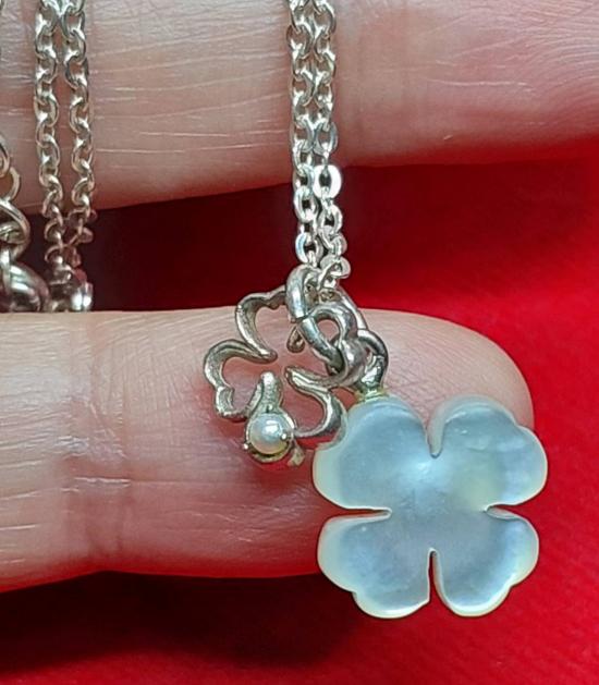 จี้ไข่มุกกับเปลือกหอยมุกแท้รูปใบโคลเวอร์ เนื้อเงิน พร้อมสร้อยเงิน 925 งานญี่ปุ่น ยาว 18 นิ้ว นน. 3.3 กร้ม
