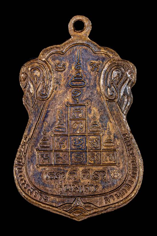 เหรียญทรงใบเสมา ครูบาขันแก้ว วัดสันพระเจ้าแดง จ.ลำพูน หลังยันต์สิบ เนื้อทองแดง ปี 2525 อายุค84 ปี เนื้อทองแดงผิวไฟเดิมๆ ด้านหลังตอกโค้ดมุมขวาด้านล่าง ขนาดเหรียญสูง 3 ซม. กว้าง 2.2 ซม. เหรียญรุ่นนี้สร้างขึ้นเมื่อต้นปี 2525 และนำมาให้ครูบาฯ เจริญพุทธมนต์ปลุกเสก 3 เดือน และพิธีปลุกเสกเมื่อวันทำบุญครบรอบอายุ 83 ปี (ย่าง 84 ปี) เมื่อวันที่ 13 พฤศจิกายน 2525 และในวันนั้นมีการสืบชะตาให้กับครูบาขันแก้ว โดยได้นิมนต์พระเถระผู้ใหญ่ อาทิ ครูบาพรหมจักร วัดพระพุทธบาทตากผ้า, ครูบาหล้า ตาทิพย์ วัดป่าตึง, พระธรรมโมลี เจ้าคณะภาค, พระญาณมงคล เจ้าคณะจังหวัดลำพูน มาทำพิธีเจริญพุทธมนต์สืบชะตา โดยมีท่านผู้ว่าราชการจังหวัด ท่านจริญญา พึ่งแสง มาร่วมแสดงมุทิตาจิตด้วย **** แต่เหรียญนี้ได้ออกให้ทำบุญจริงๆ ตอนต้นปี 2526 เพราะเป็นปีที่ครูบาขันแก้ว อายุ 84 ปี ซึ่งที่จริงแล้วหมอสมสุข ตั้งใจจะออกให้ทำบุญครบรอบวันเกิดของครูบาขันแก้ว แต่ท่านก็มาด่วนมรณภาพไปเสียก่อนเมื่อวันที่ 3 กรกฎาคม 2526 ปัจจุบันเหรียญรุ่นนี้ไม่ค่อยเจอะเจอแล้ว ลูกศิษย์ลูกหาเก็บกันหมดครับ เหรียญแท้ดูง่าย เอาไปเลี่ยมให้ลูกหลานใช้ครับ พุทธคุณเยี่ยม รับประกันตามกฏเวปจี เหรียญแดงหน้าหลังทั้งเหรียญ