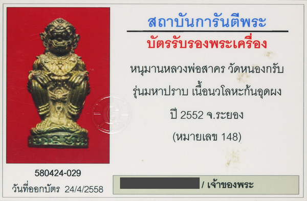 หนุมานมหาปราบ(รุ่นแรก) หลวงพ่อสาคร วัดหนองกรับ เนื้อนวโลหะ ปี2552 หมายเลข148 สร้างน้อย หายาก สภาพสวยเดิมครับ
