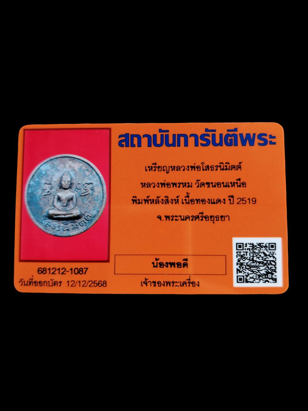 เหรียญโสธรนิมิตรหลวงพ่อพรหมวัดขนอนเหนือ ปี 2519 มาพร้อมบัตรรับรอง