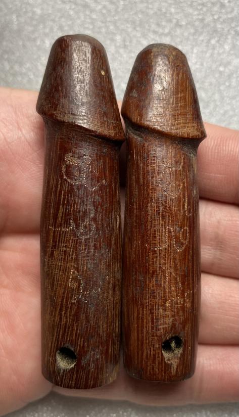 ปลัดขิกเนื้อไม้ จารเครื่อง ไม่ทราบที่ 2 ตัวค่ะ ขนาดยาว 3 นิ้วค่ะ