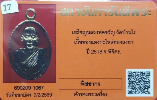เหรียญหลวงพ่อขวัญ วัดบ้านไร่ เนื้อทองแดงกะไหล่ทองลงยาสีแดง ปี2518 จ.พิจิตร พร้อมบัตรรับรอง