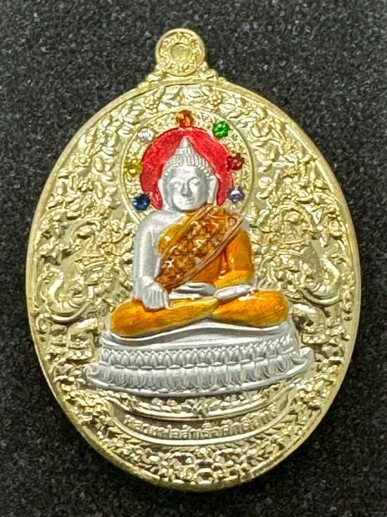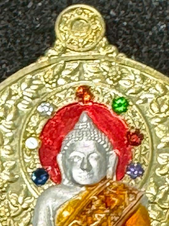 เหรียญฟลวงพ่อสำเร็จ ศักดิ์สิทธิ์ ย้านหนองตาโล่ สระบุรี เนื้อชุบทองฝังพลอย 7 สี ลงยารัศมีแดงหน้ากากองค์เงิน ลงยาจีวร หมายเลข 19