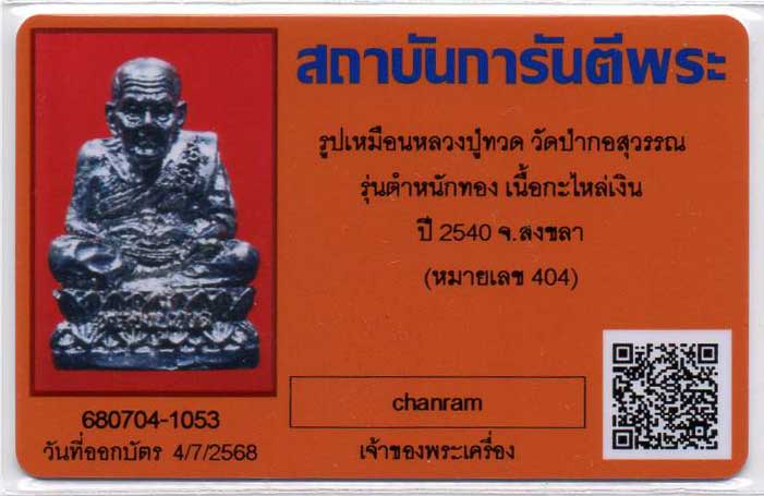 หลวงปู่ทวด รุ่นตำหนักทอง หลวงปู่ทอง สุสังวโร วัดป่ากอสุวรรณาราม อ.นาหม่อม จ.สงขลา ปี2540 ลอยองค์กะไหล่เงิน ตอกโค๊ด ตอกหมายเลข.๔๐๔