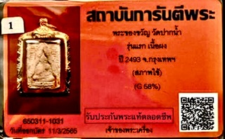 รับประกันความสมบูรณ์ขององค์พระ ไม่มีรอยแตกหักหรือการซ่อมแซม สภาพยังคงความเดิมๆ เนื้อหาจัดเป็นพระแท้ที่ดูง่าย สามารถแขวนบูชาและเป็นองค์ครูในการดูเนื้อพระผงของขวัญรุ่นแรก มาพร้อมกรอบทองคำเปอร์เซนทองประมาณ58% และบัตรรับรองพระแท้จากเว็บจี ++รับประกันความแท้ตามมาตรฐานสากลทุกประการครับ