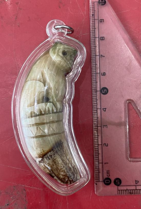 เขี้ยวหมูตันแกะเสือ จานอักขระเต็ม สภาพดี เลี่ยมกันน้ำพร้อมใช้ครับ