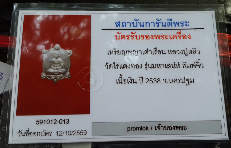 | ชื่อพระเครื่อง | เหรียญพญาเต่าเรือน หลวงปู่หลิว รุ่นมหาเสน่ห์ พิมพ์จิ๋ว เนื้อเงิน ปี 2538 จ.นครปฐม |