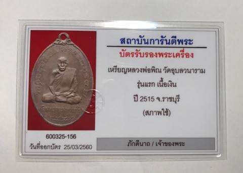 | ชื่อพระเครื่อง | เหรียญหลวงพ่อพิณ วัดอุบลวนาราม รุ่นแรก เนื้อเงิน พร้อมบัตรรับรอง |