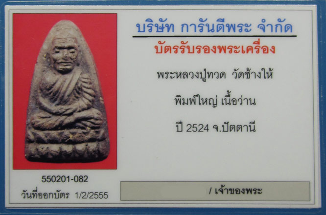 พระหลวงปู่ทวด เนื้อว่าน ปี24 พิมพ์ใหญ่ สภาพสวยพร้อมเลี่ยมทองยกซุ้ม(มีบัตรรับรอง)