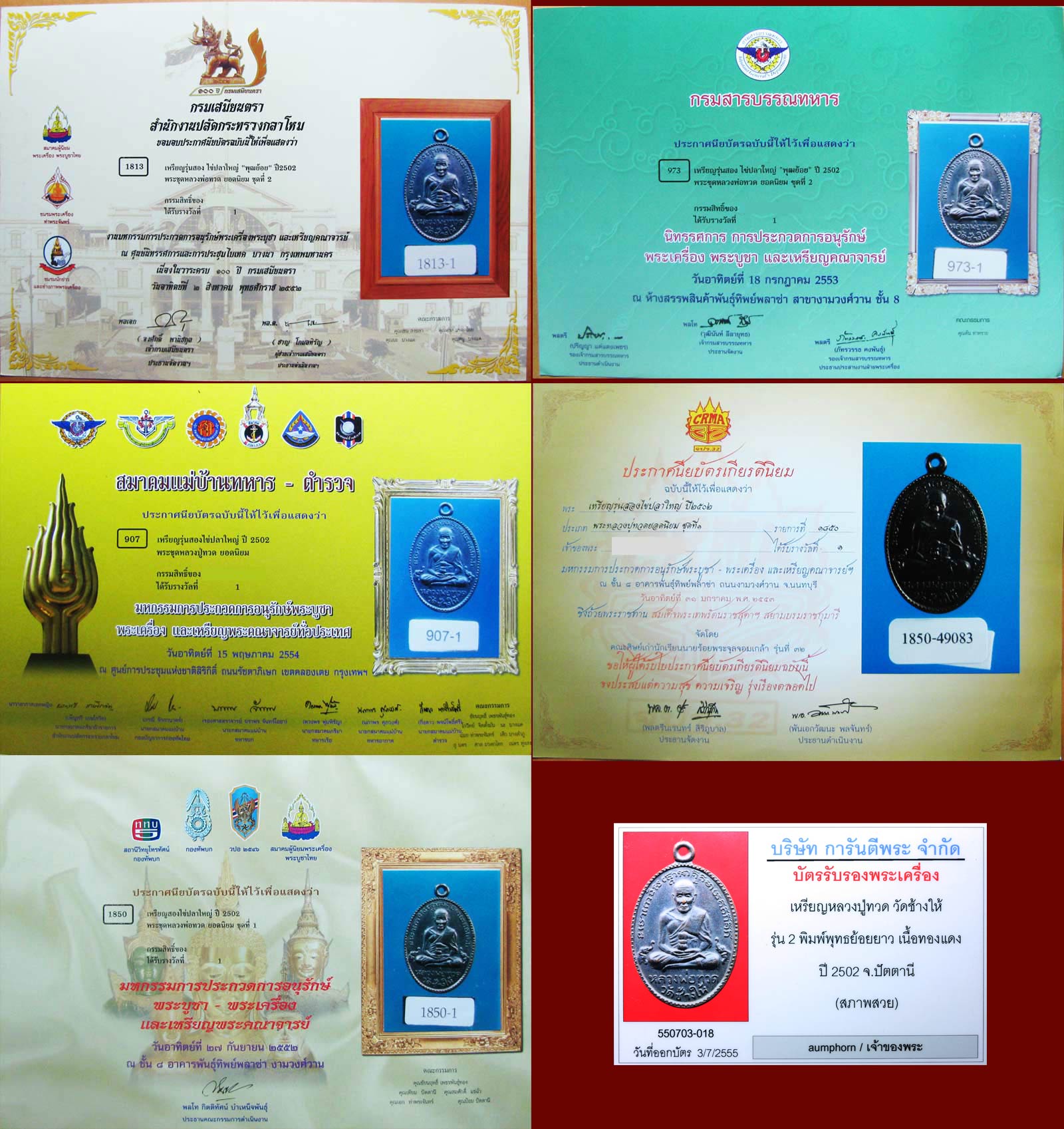 เหรียญหลวงปู่ทวด รุ่นสอง ปี2502 พิมพ์ไข่ปลาใหญ่ พุฒย้อยยาว ไม่สวยยังหายาก แต่องค์นี้สวยสุดๆ...... การันตี 3 แช้มป์งานใหญ่มาก และ 2 แช้มป์งานใหญ่... รวม 6 งาน.... แช้มป์ตลอดกาล ไม่ว่างานระดับใหน.................... ..........แช้มป์ที่ 1 ประเดิมงานใหญ่ระดับโลก ณ ศูนย์นิทรรศการและการประชุมไบเทค บางนา วันอาทิตย์ ที่ 2 สิงหาคม 2552 กรมเสมียนตรา สำนักงานปลัดกระทรวงกลาโหม โดย พลเอก จงศักดิ์ พานิชกุล เจ้ากรมเสมียนตรา ...........แช้มป์ที่ 2 งานใหญ่ระดับชาติ โดยกองทัพบก & นักศึกษา วปอ. 2546 ณ อาคารห้างสรรพสินค้าพันทิพย์พลาซ่า ในวันอาทิตย์ ที่ 27 กันยายน 2552 ถ่ายทอดทางชอง5 ........................................................... .......... แช้มป์ที่3 งานไม่ใหญ่มาก นักเรียนนายร้อยพระจุลจอมเกล้า รุ่นที่ 32 ชิงถ้วยพระราชทาน สมเด็จพระเทพรัตนราชสุดาฯ สยามบรมราชกุมารี ณ ชั้น 8 อาคารพันทิพย์พลาซ่าในวันอาทิตย์ ที่ 31 มกราคม พ.ศ. 2553 ..........แช้มป์ที่4 งานกรมสารบรรณทหาร ณ ห้างสรรพสินค้าพันทิพย์พลาซ่า ในวันอาทิตย์ ที่ 18 กรกฎาคม พ.ศ.2553..................................................................................................................................... ...........แช้มป์ที่5 งานใหญ่ระดับชาติ งานสมาคมแม่บ้าน ทหาร - ตำรวจ ณ ศูนย์การประชุมแห่งชาติสิริกิติ์ ในวันอาทิตย์ ที่ 15 พฤษภาคม 2554..................................................................................................................... แช้มป์ที่6 งานมหาลัยธรรมศาสตร์ วันที่ 9 ก.ย. 2555............................................................................... ...............พร้อมบัตรสภาพสวย พร้อมตลับทองหนาๆสวยๆ