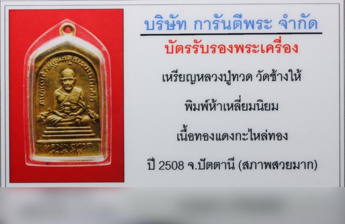 เหรียญหลวงปู่ทวดพิมพ์ห้าเหลี่ยม (พิมพ์นิยม) ปี2508 เนื้อทองแดงกะไหล่ทอง สภาพสวยมาก จมูกได้รูปทั้งหน้าหลัง กะไหล่เดิมมากๆ ปลอดภัยจากการเสริมแต่งแน่นอน บัตรสภาพสวยมาก สวยมากจริงๆ