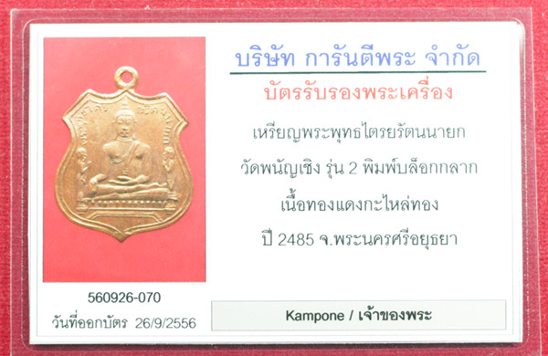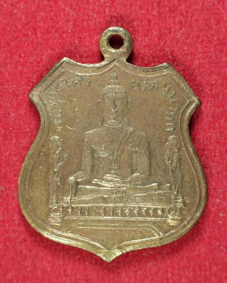 เหรียญพระพุทธไตรยรัตนนายก((หลวงพ่อโต)) วัดพนัญเชิง รุ่น 2 พิมพ์บล็อกกลาก เนื้อทองแดงกะไหล่ทอง ปี2485 จ.พระนครศรีอยุธยา