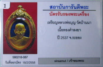 หลวงพ่อบุญ เนื้อทองคำลงยา ปี 2537 วัดบ้านนา จ.ระยอ