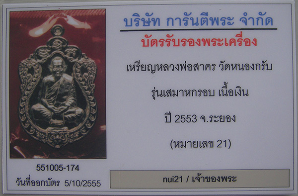 เหรียญหลักหลวงพ่อสาคร เสมา6รอบเนื้อเงินขาวNo.21