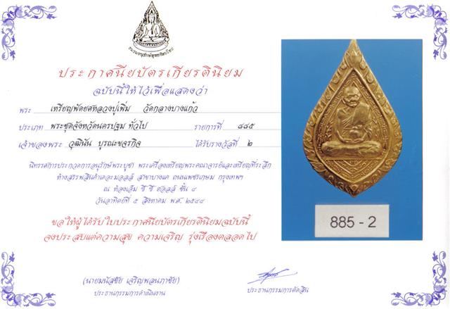 เหรียญพัดยศหลวงปู่เพิ่ม วัดกลางบางแก้ว กะหลั่ยทองเดิมๆสวยมากไม่ได้ใช้ พิเศษจาร 2ตัว กรอบเลี่ยมทองพร้อมใช้(พร้อมใบประกาศรางวัลที่2 งานเซียนใหญ่ ช่างสะพานพุทธ ปี 2544) พระพุทธวิถีนายก (หลวงปู่เพิ่ม ปุณณวสโน) นามเดิมว่า "เพิ่ม" ท่านเกิดเมื่อวันที่ 28 มกราคม พ.ศ.2429 ที่ตำบลไทยวาส อำเภอนครชัยศรี จังหวัดนครปฐม โยมบิดาชื่อ เกิด โยมมารดาชื่อ วรรณ ท่านบรรพชาเป็นสามเณรเมื่ออายุได้ 8 ขวบ สืบต่อมาจนอายุครบบวช จึงได้อุปสมบทในวันที่ 12 กรกฎาคม พ.ศ.2450 ณ พัทธสีมาวัดกลางบางแก้ว โดยมีสมเด็จพระสังฆราชแพ ครั้งยังดำรงสมณศักดิ์เป็นสมเด็จพระวันรัต วัดสุทัศน์ เป็นพระอุปัชฌาย์ เหรียญรุ่น 4.เหรียญรูปพัดยศของหลวงปู่ งานทำบุญวันเกิดหลวงปู่เพิ่มครบรอบ 89 ปี ในปี พ.ศ. 2517 ตรงกลางเป็นรูปหลวงปู่นั่งสมาธิเต็มองค์ ห่มพาดสังฆาฏิรอบขอบเป็นลายกนกเช่นเดียวกับพัดยศชั้นเจ้าคุณของท่าน ด้านพื้นข้างองค์ของหลวงปู่เป็นลวดลายพื้นพัดเช่นกัน ช่องลายใต้ฐานมีอักษรไทยเป็นเลขไทยตัวเล็ก ๆ เขียนว่า 17 หากไม่สังเกตให้ดีจะมองไม่เห็น ตัวเลขนี้แสดงถึงปี พ.ศ. 2517 นั่นเอง ด้านหลังของเหรียญเป็นยันต์ นะโมพุทธายะ แบบพุทธซ้อนตรงกลางแล้วมีอักษรไทยเขียนด้านล่างอ่านว่า หลวงปู่เพิ่มอายุครบ 89 ปี บรรทัดล่างอ่านว่า วัดกลางบางแก้ว ส่วนมุมบนข้างขอบเหรียญจะมีรอยหลวงปู่ลงจาร เฑาะว์มหาอุด บางอันก็จะลง เฑาะว์มหาพรหม แบบเฑาะว์ขึ้นยอดก็มี เหรียญรุ่นนี้ตัดขอบชิดลายแบบไม่มีห่วง ฝีมือแกะแบบตื้น ๆ แต่ลายละเอียดคมชัด สร้างจำนวน 3,000 เหรียญ